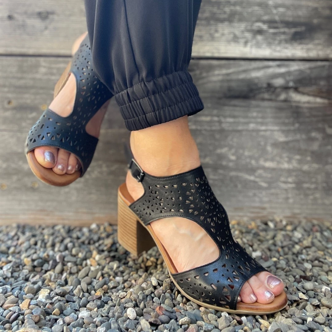 Anything but basic the Anne from Anesha boosts confidence with its stylish laser cut details and perfectly stacked heel. With an adjustable heel strap, you’re sure to turn heads while never missing a beat on comfort.