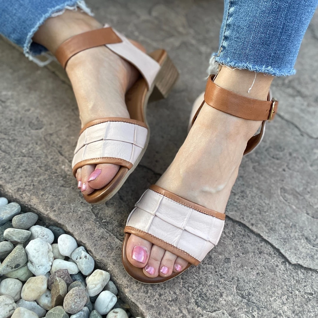 Chic details make this two-piece sandal the perfect addition to just about any spring closet. With its versatile styling you can go from work to play without missing a beat on comfort or fashion. The leather wrapped soft cushion insole and flexible shock absorbent rubber outsole sits comfortably on a stylish stacked heel.