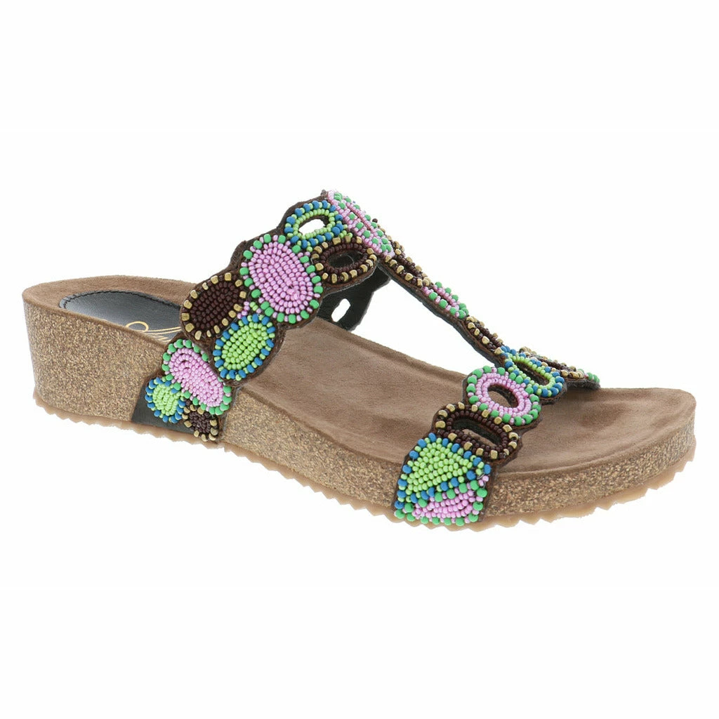 Classic yet fun t-strap slide featuring vibrant beadwork on a cork-like comfort wedge.