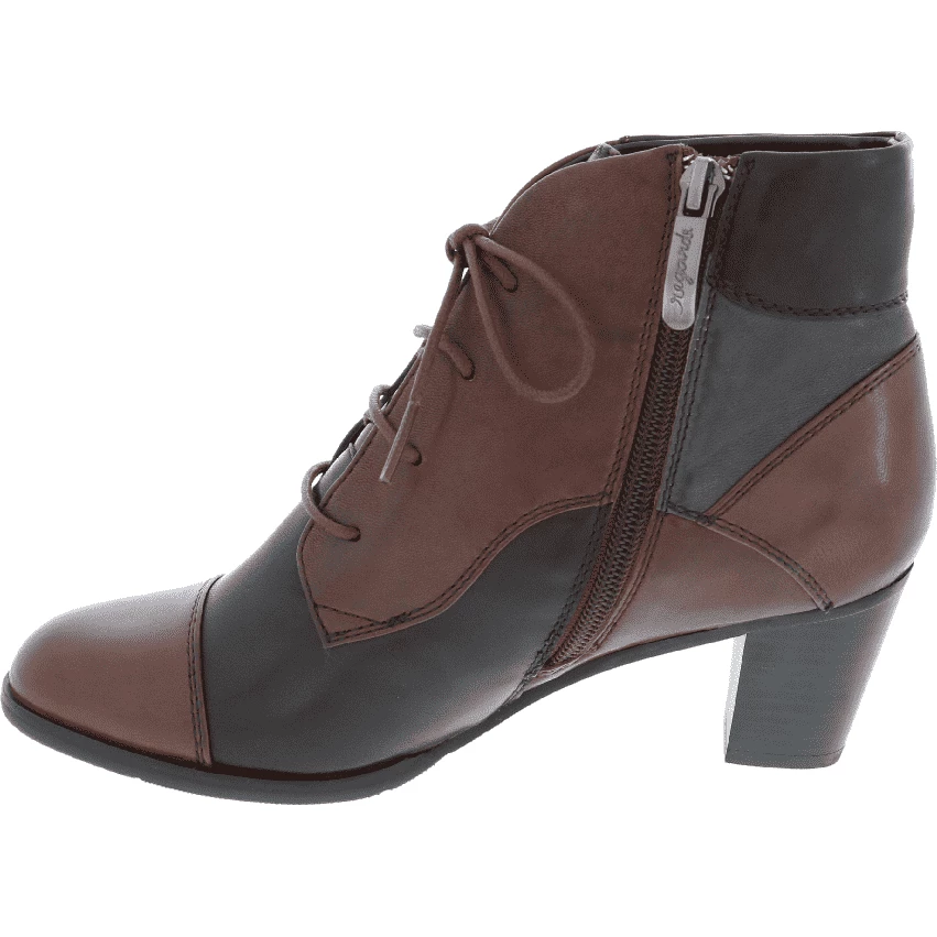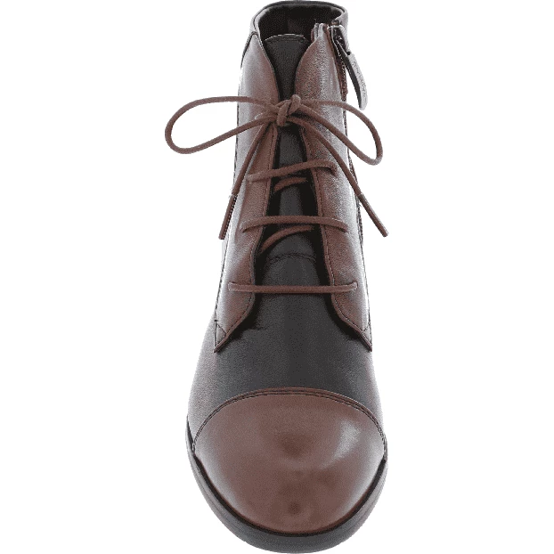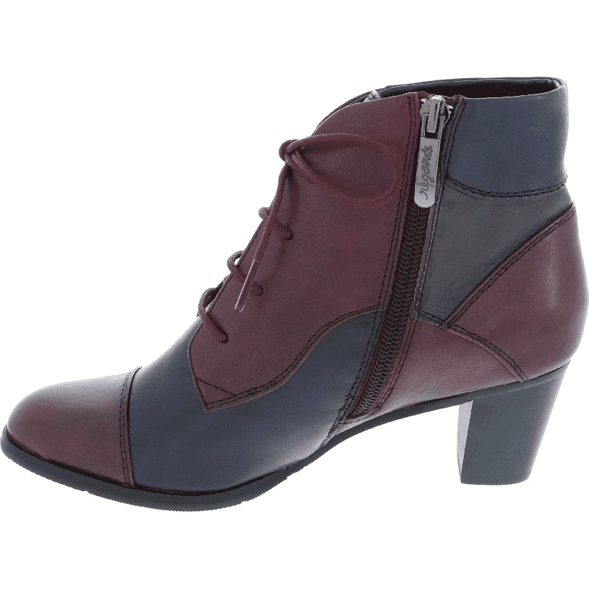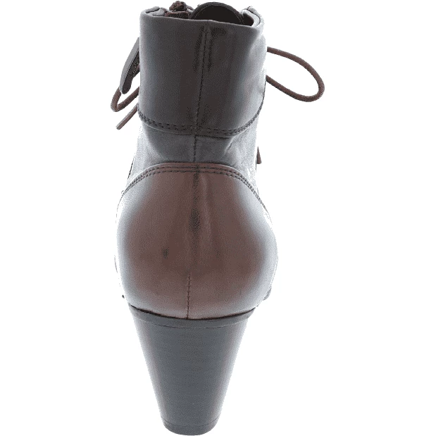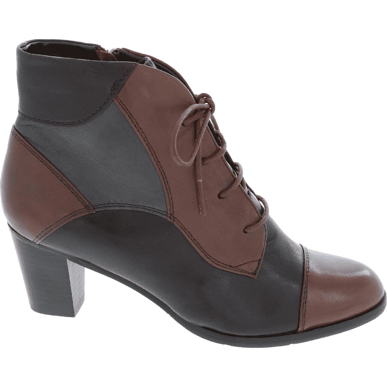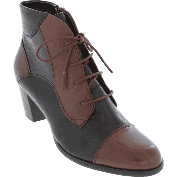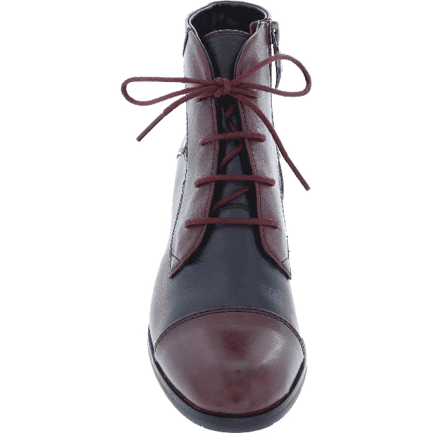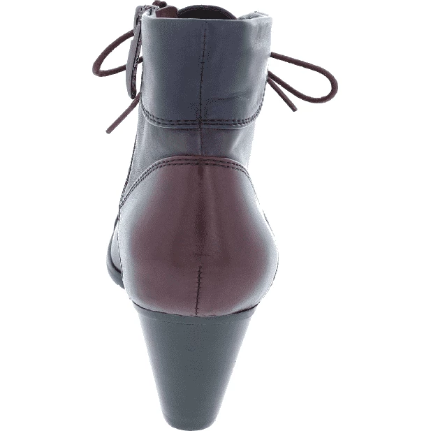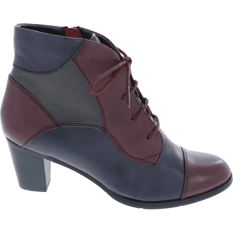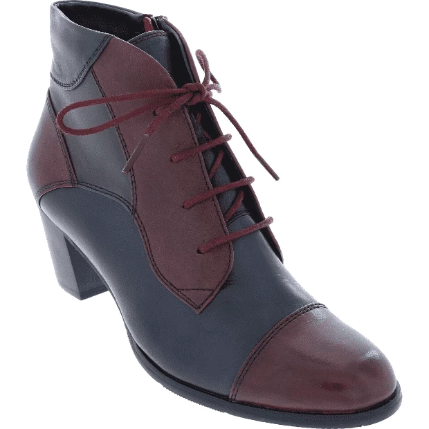 Handcrafted from soft Glove Sangria, Melanzana and Muddy leather. The Glove leather patchwork detail, material combination, stitching details and laces are the essence of this ankle bootie. A 55mm block heel. Fully Lined. Geometric cuts. The stitching is accentuated. An inner zipper for fastening. High-density foam and instant-forming memory footbed.