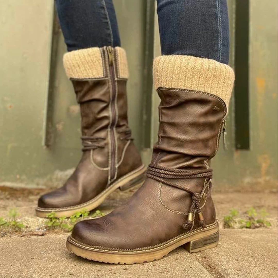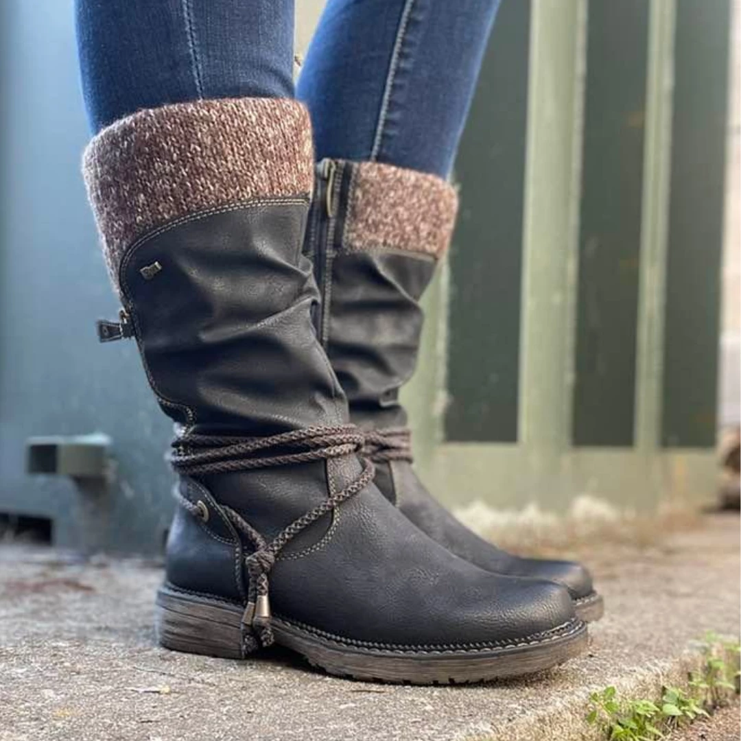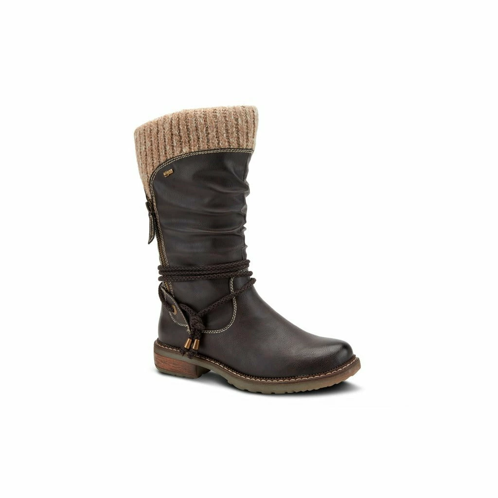 Experience the comfort revolution in this water resistant man-made leather pull-on boot featuring a decorative outside zipper and a rope ankle strap design all on a chunky and sculpted heel.
