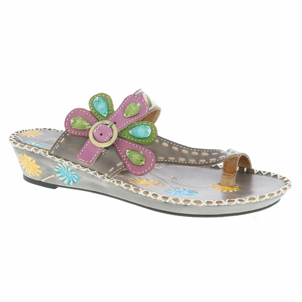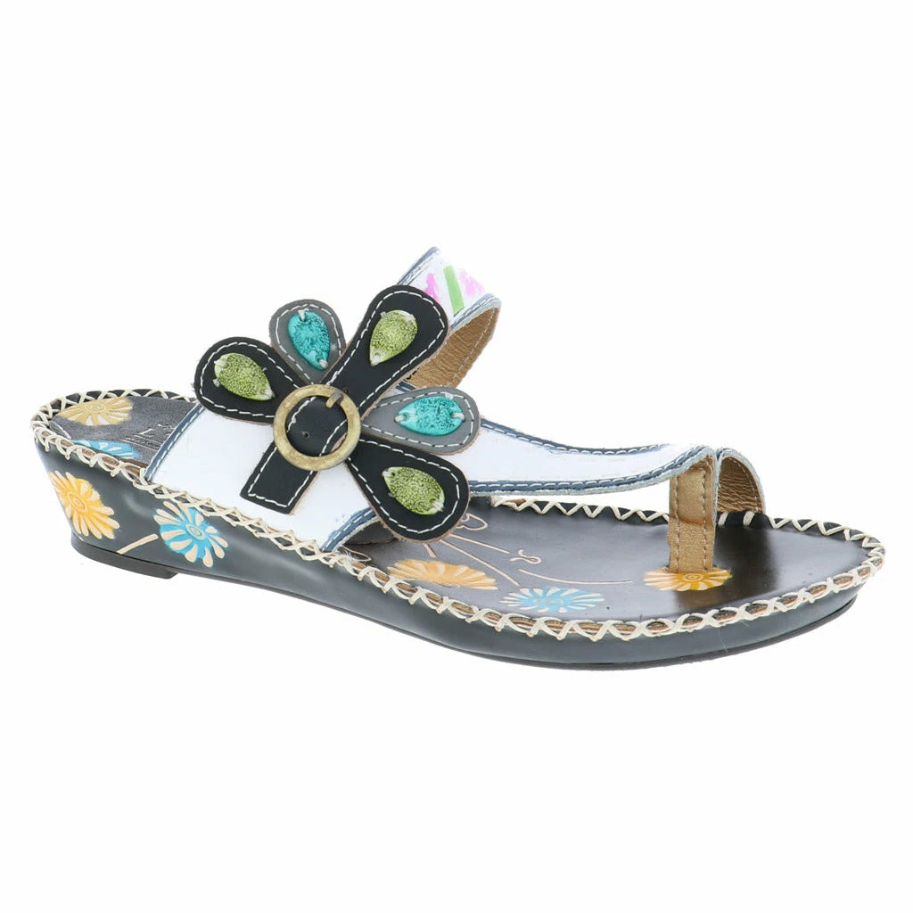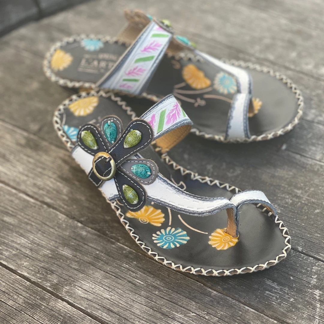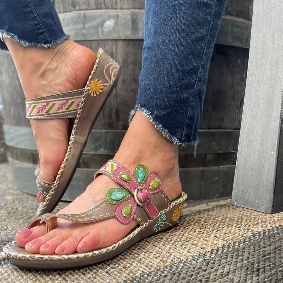 French inspired design, hand painted leather toe-ring thong sandal featuring a jeweled tear drop stones and a floral embossed insole.