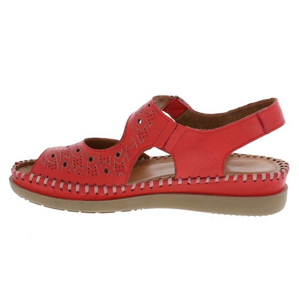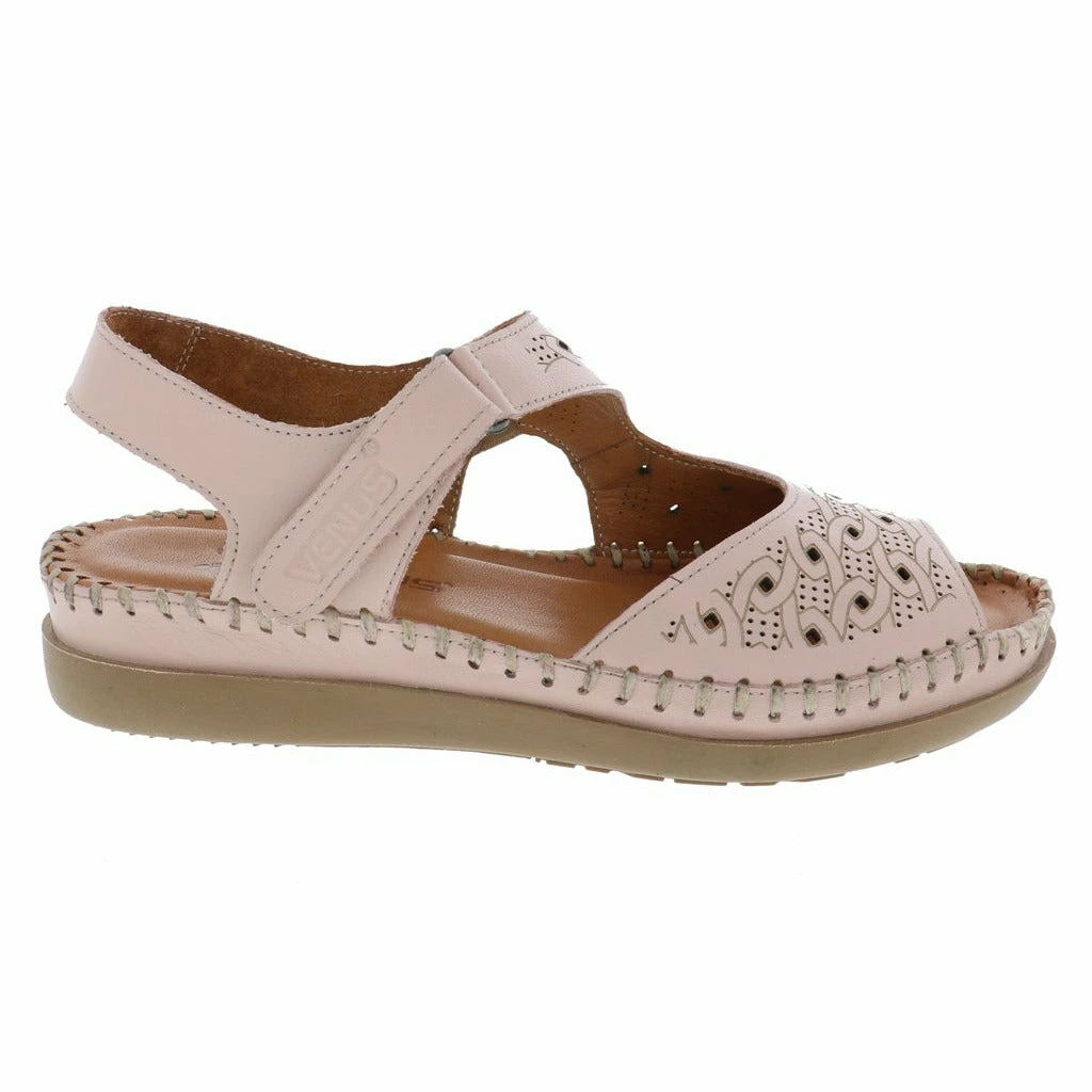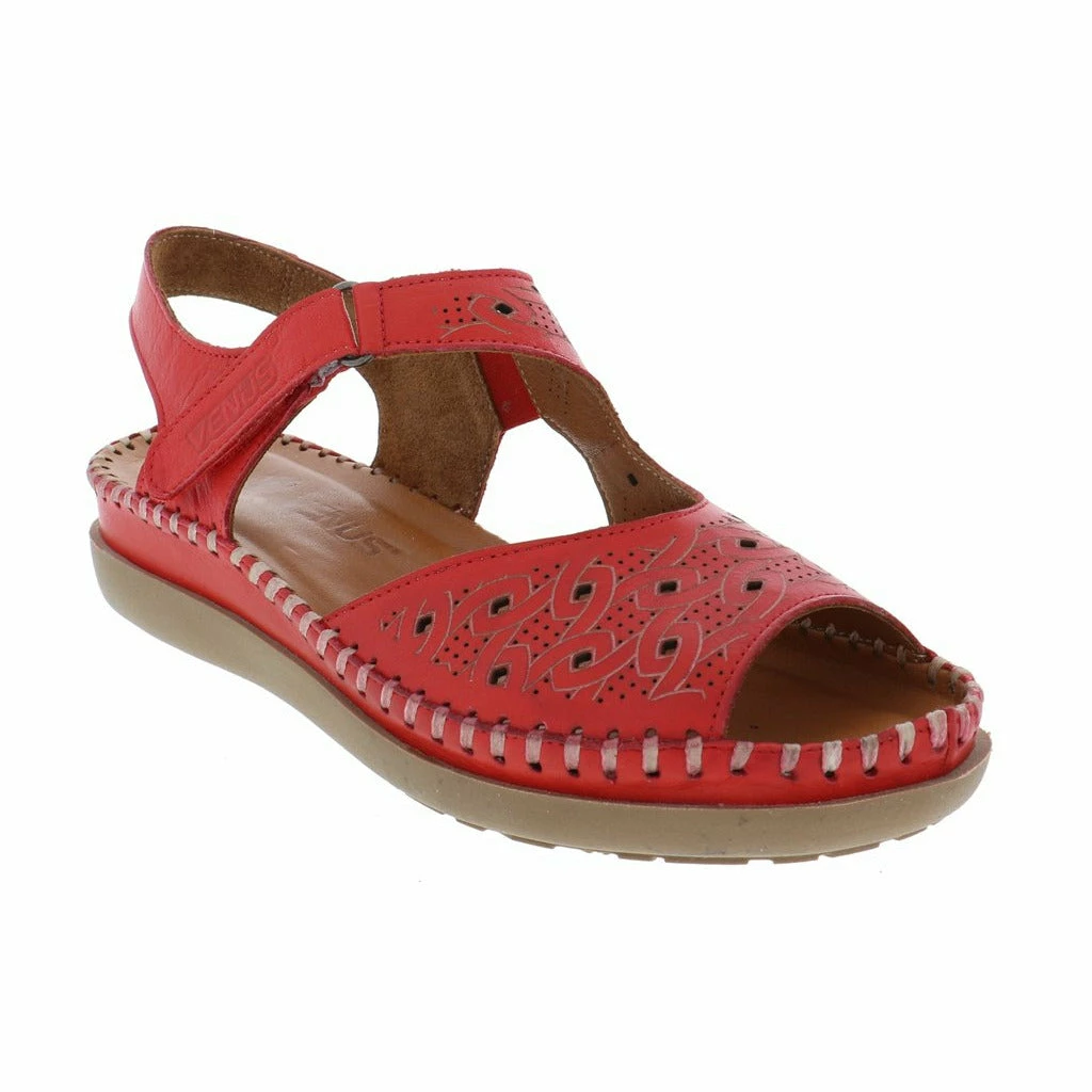 Dress up your summer vibes with the new women’s walking sandal by Venus. This stylish genuine leather upper features unique etched detailing and perforated designs throughout. The fully adjustable Velcro strap adjusts perfectly to your foot ensuring a perfect fit every time. The moisture wicking cushioned leather insole molds to your feet while the flexible rubber outsole keeps you moving forward in stylish comfort.