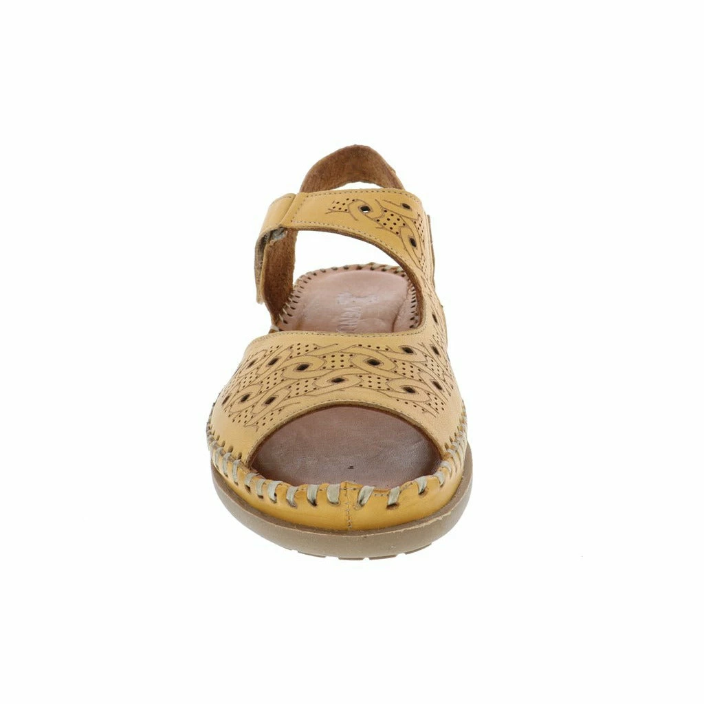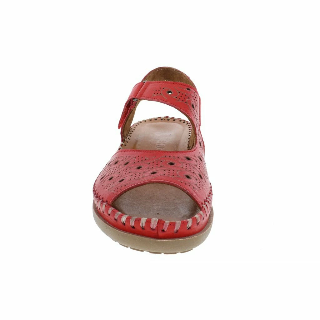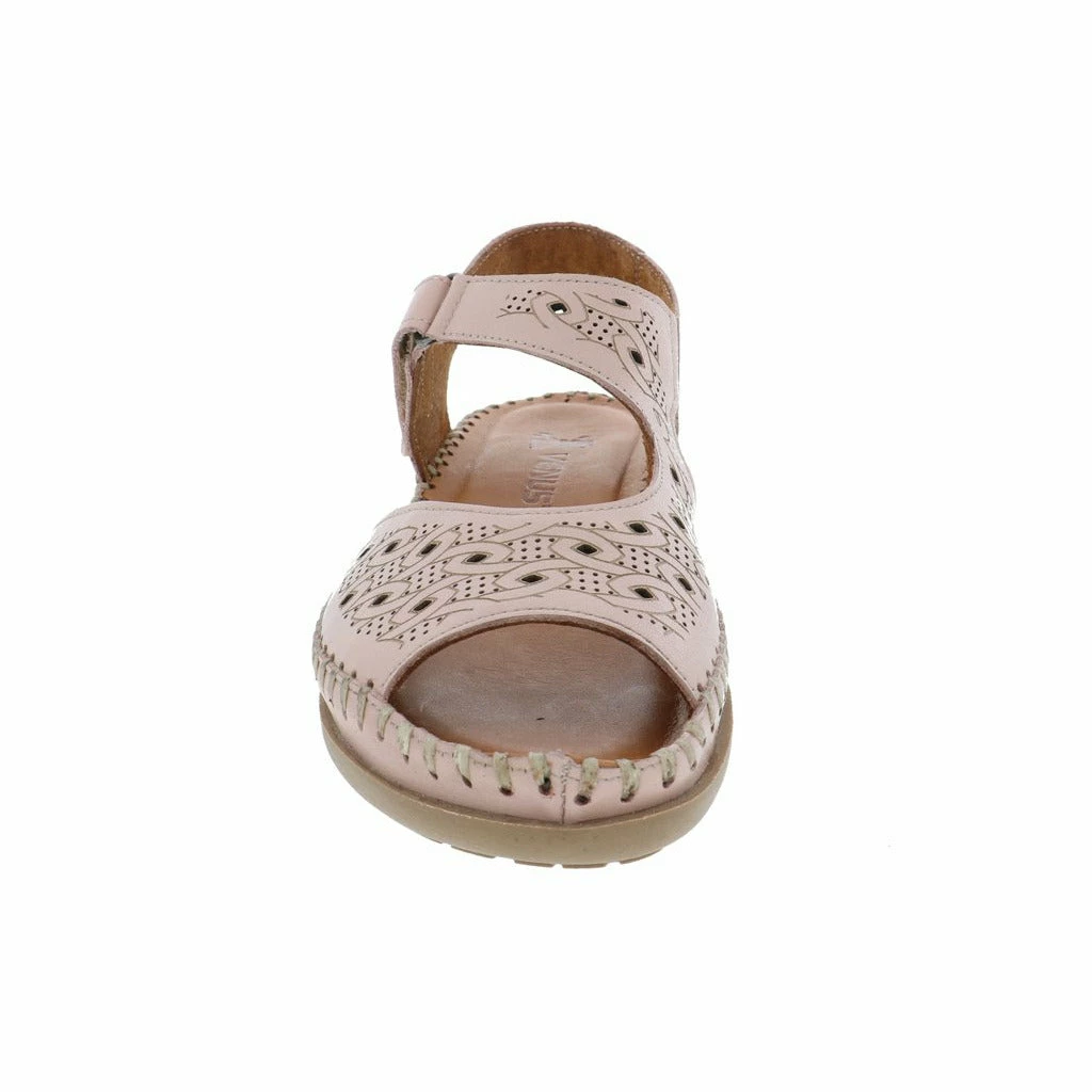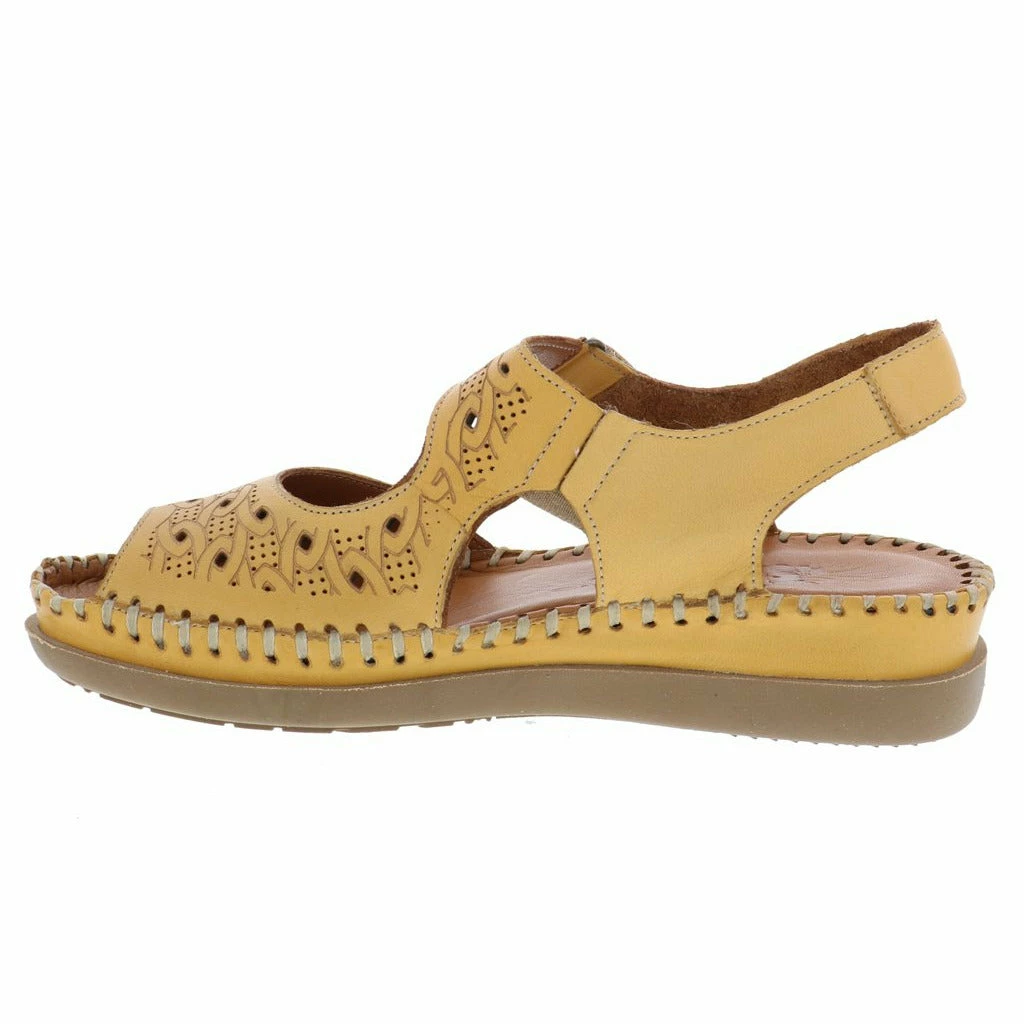 Dress up your summer vibes with the new women’s walking sandal by Venus. This stylish genuine leather upper features unique etched detailing and perforated designs throughout. The fully adjustable Velcro strap adjusts perfectly to your foot ensuring a perfect fit every time. The moisture wicking cushioned leather insole molds to your feet while the flexible rubber outsole keeps you moving forward in stylish comfort.